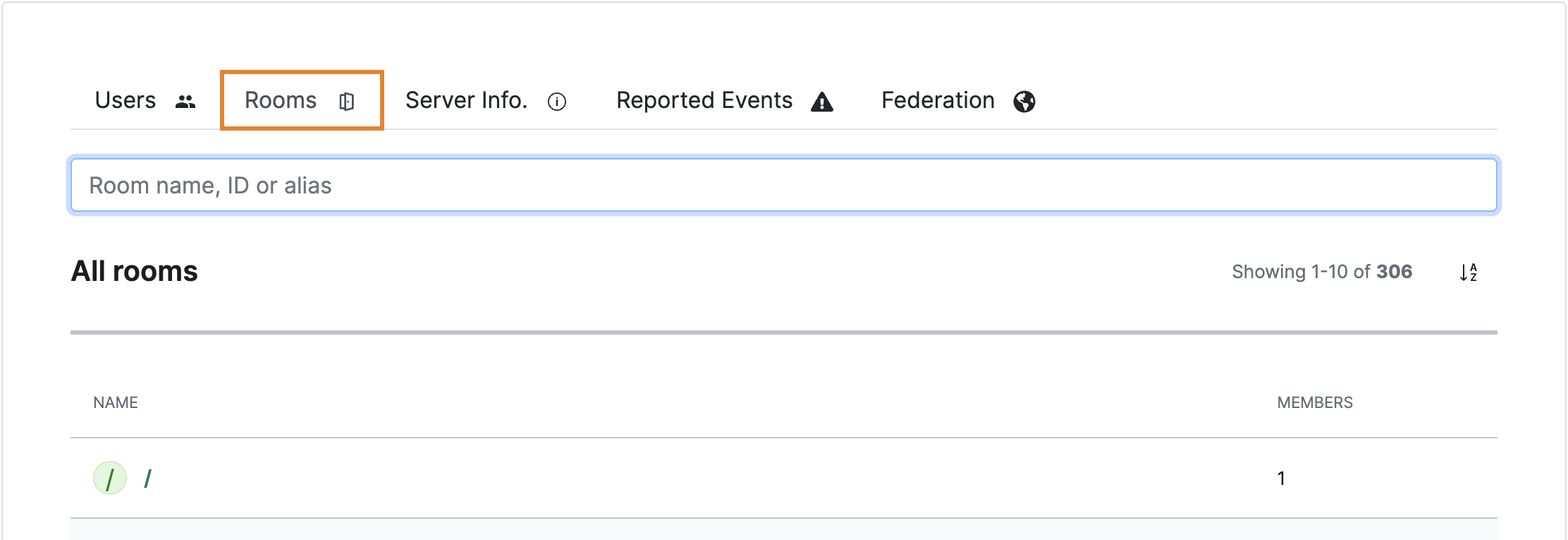 Use the search bar to search for rooms in your homeserver. Enter the room name, ID, or alias.