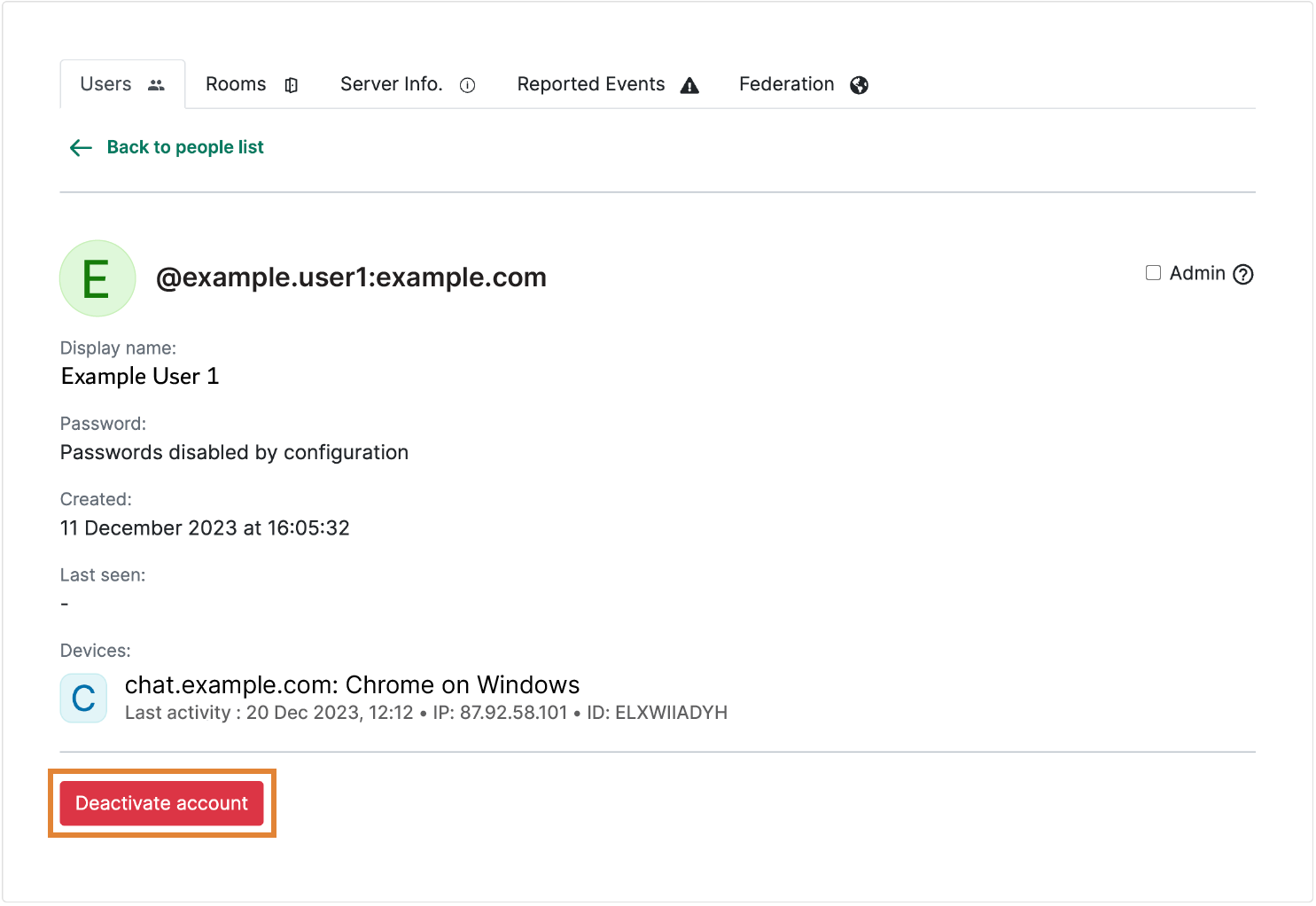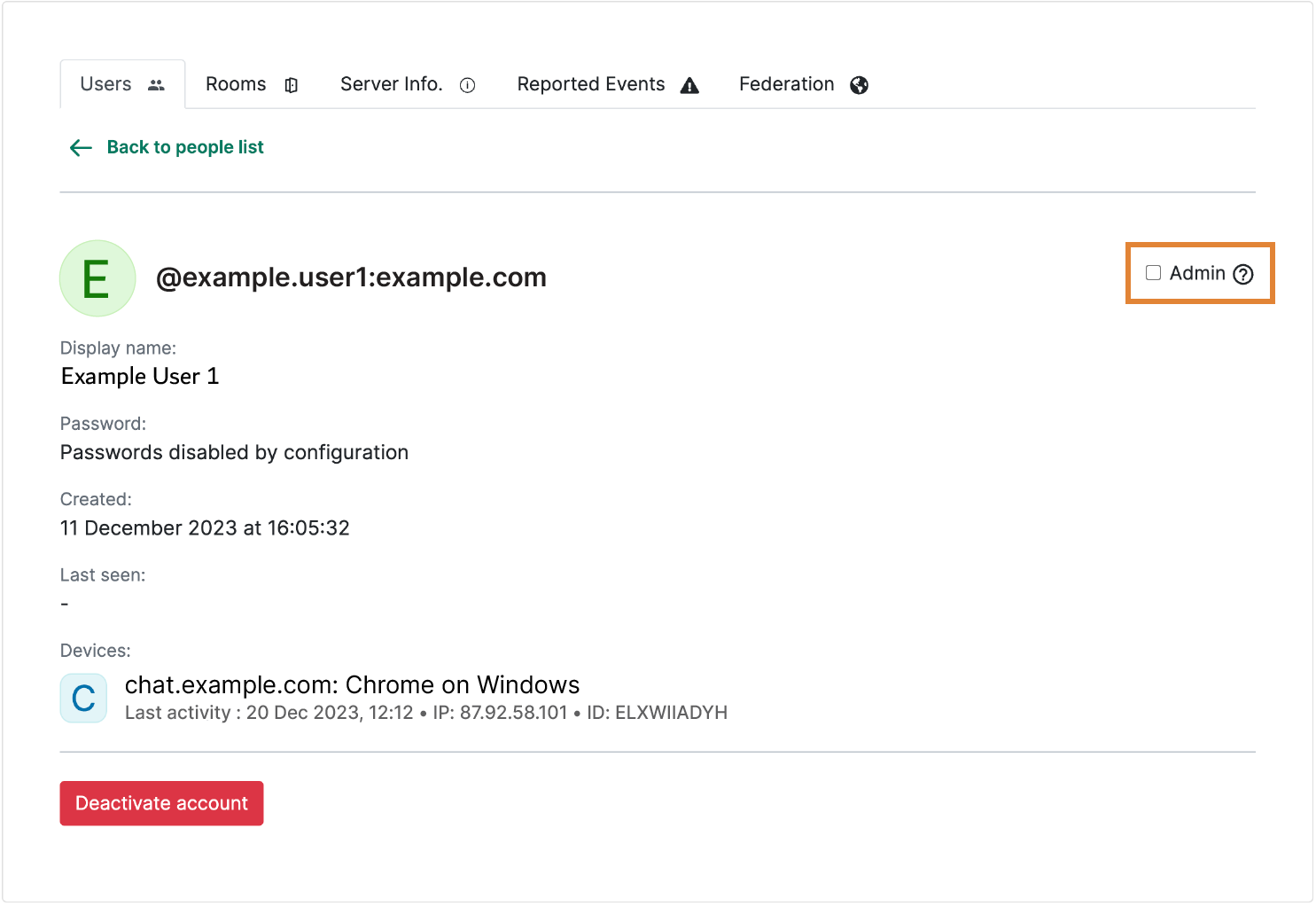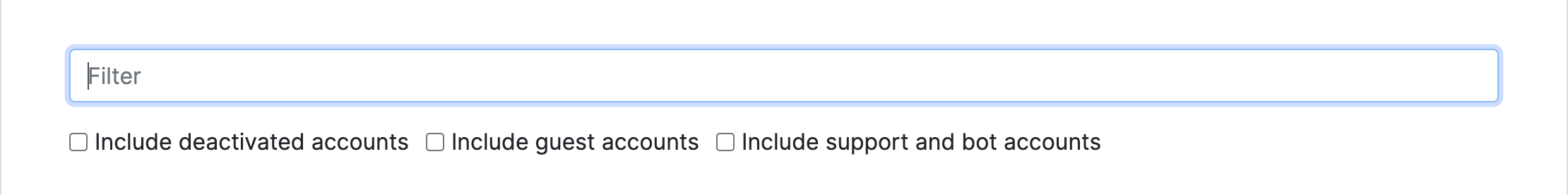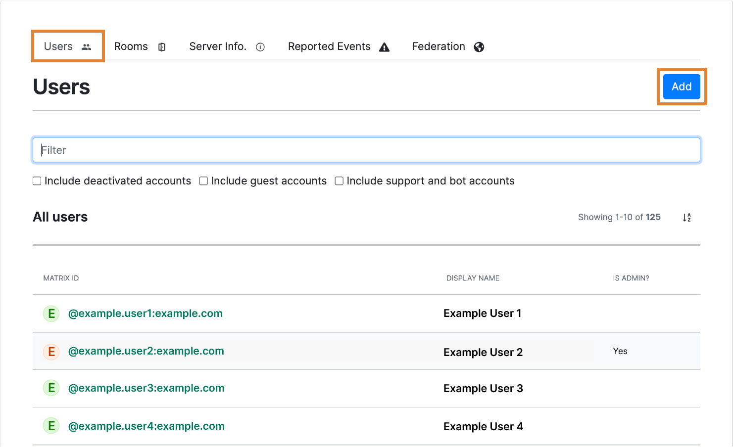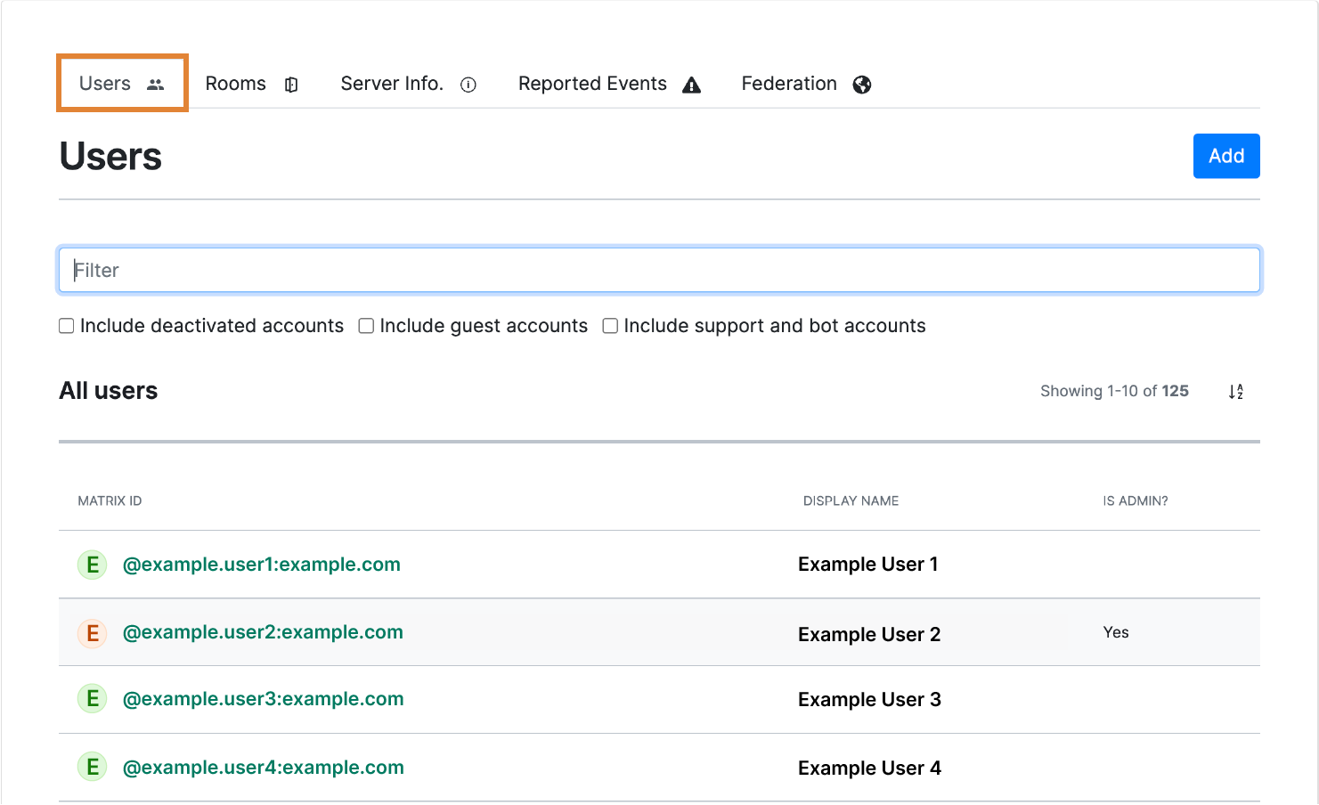 Use the search bar to search for users in your homeserver. You can use the check boxes below to filter search results.