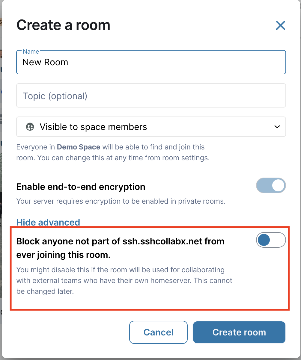 If the room creator enables this option, the room will be non-federated, and there will be no possibility of inviting externals from federating servers.
