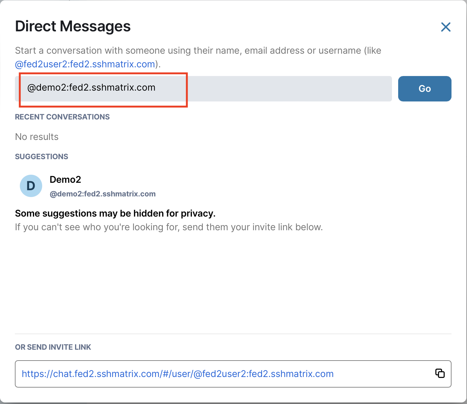 To find a person from another home server, the user should use the whole link of the user ID with @ (e.g., @user:customerdomain.com).