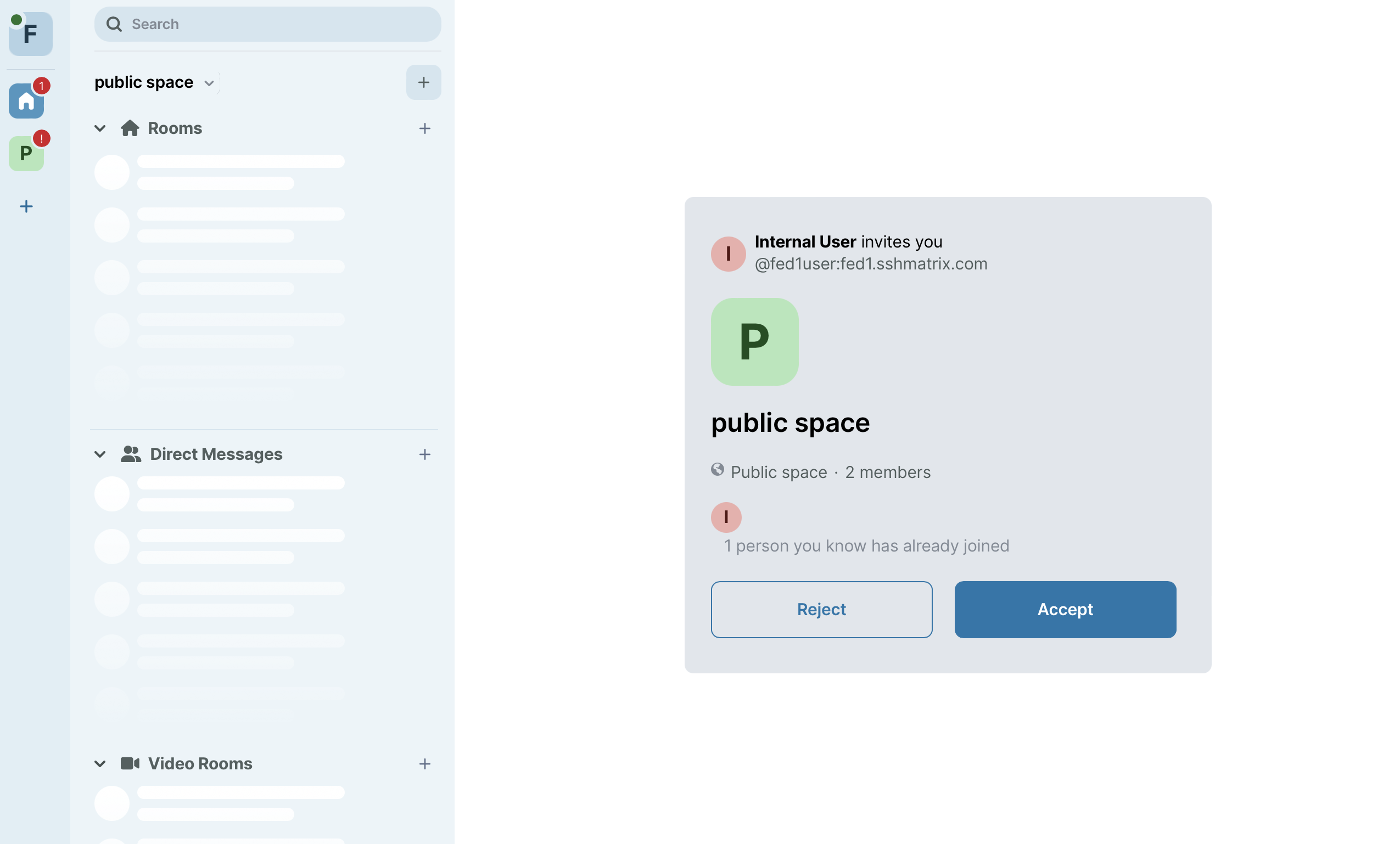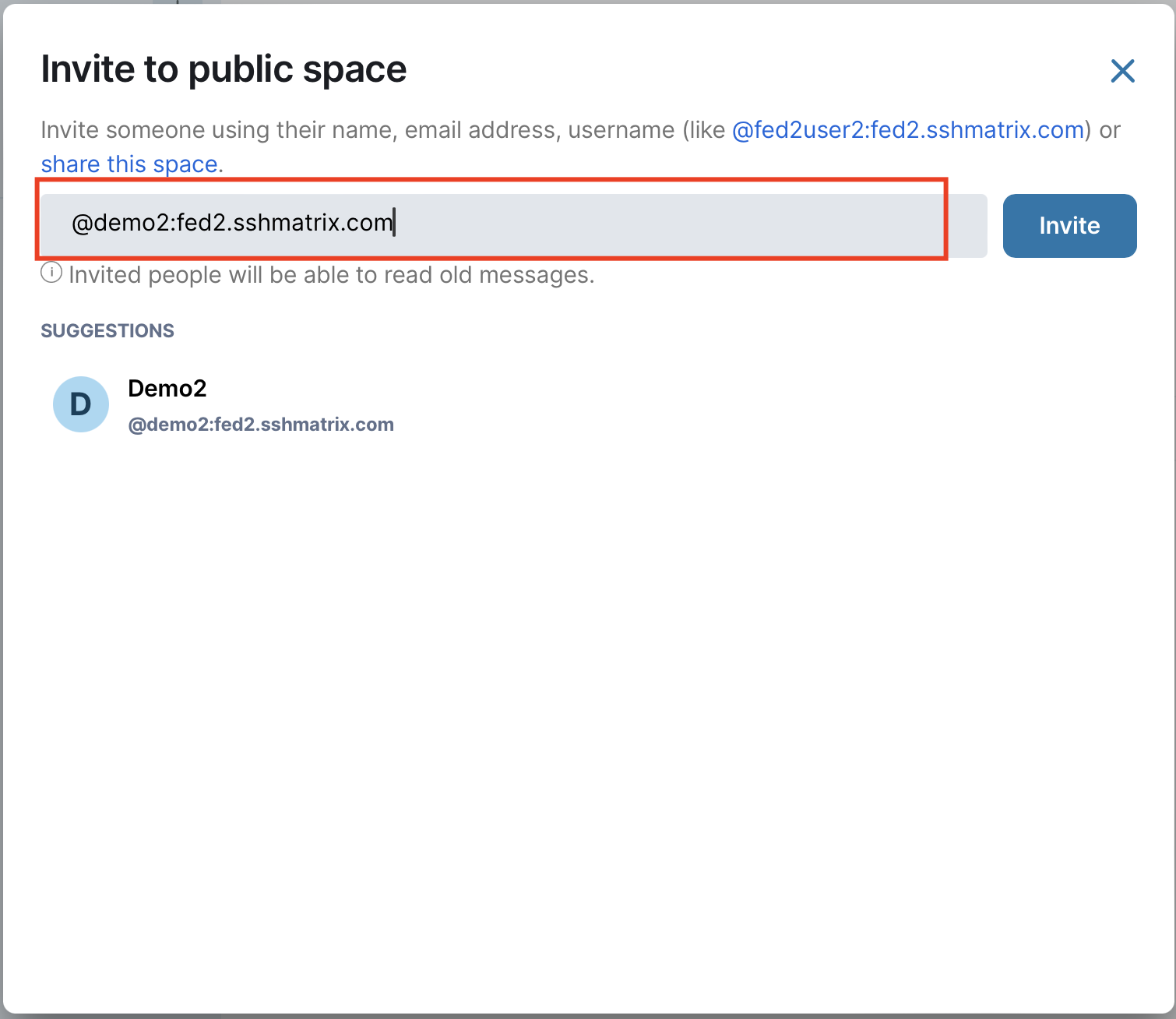If the user selects “Private room (invite only)” and allows federation, the user can invite both internal and federating users to the room. However, anyone, regardless of whether they are internal or federated users, cannot join this room without an invitation.