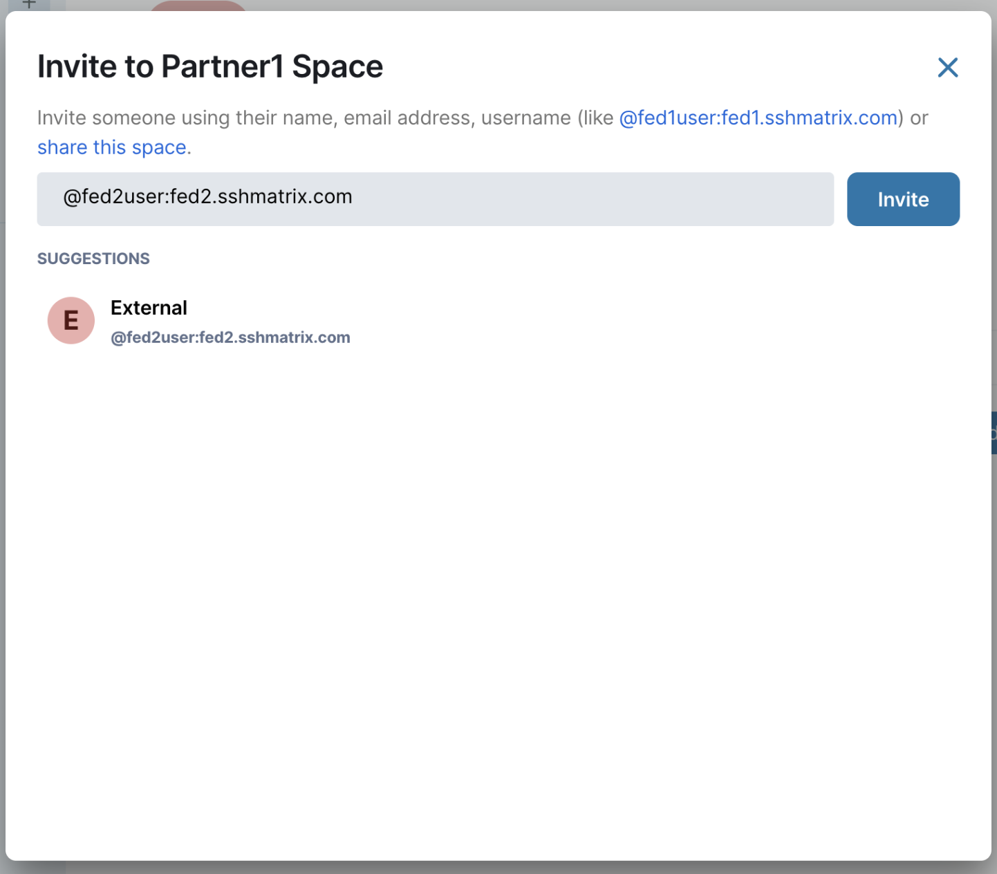 To invite an external user from a federating server, the user should input the complete matrix ID of the external user. Then the user will be able to see the name and invite the external user.