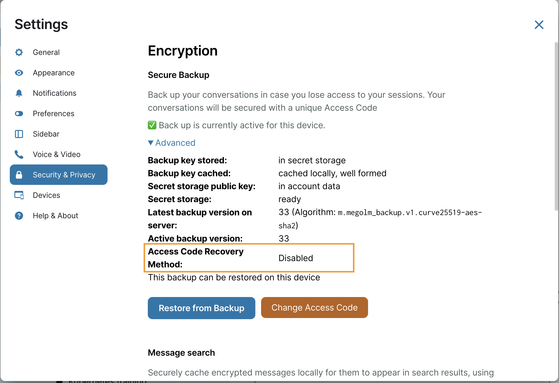 📌 Settings → Security & Privacy → Access Code Recovery Method (Available on Desktop/Web Apps)