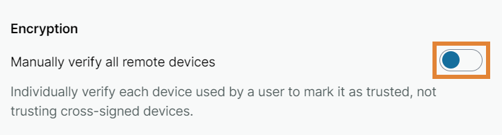 Under Advanced and Encryption, click the toggle to the on position to manually verify each device to mark it as trusted, not trusting cross-signed devies. The default setting is off.