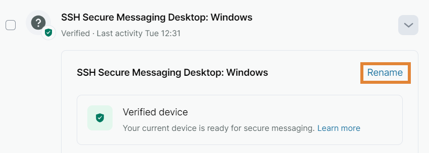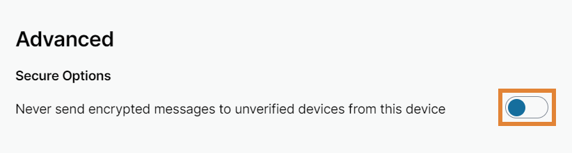 Under Advanced and Secure Options, click the toggle to enable or disable sending encrypted messages to unverified devices from this device. The default setting: off.