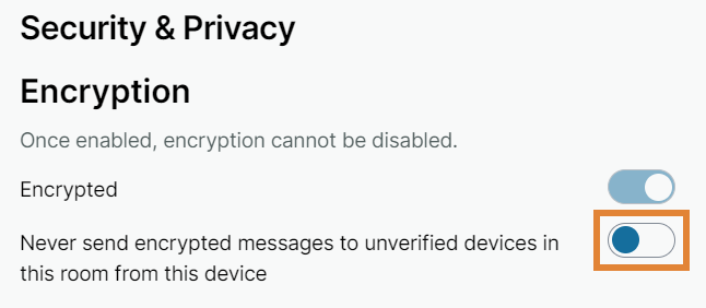 Click the toggle to enable or disable sending encrypted messages to unverified devices in this room from this device. The default setting: off