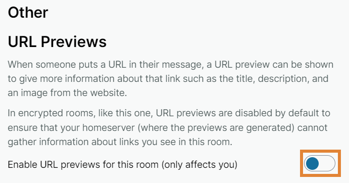 - Under the General tab, scroll down to Other and URL Previews, and click the toggle to enable or disable URL previews.