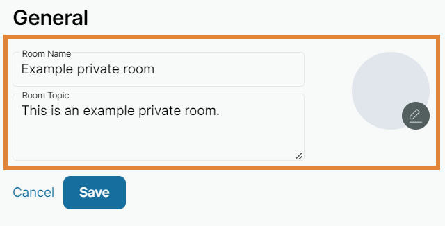 Under the General tab, enter the new name, topic, and picture of the room.