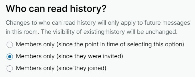 NOTE. When end-to-end encryption is enabled, users will only see messages sent after they join the room, as they don’t have the encryption keys for earlier messages.