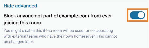 Under the advanced settings, you can block anyone who is not part of the same server from ever joining your room. You can enable this setting if the room is only used for collaborating with internal teams on your homeserver.