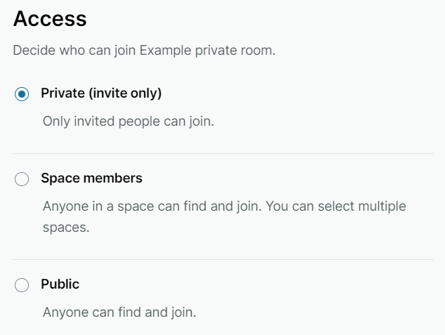 Visible to space members. Everyone in the space will be able to find and join your room.