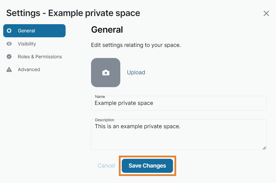 - Under the General tab, you can change the name, description, and picture of the space.
