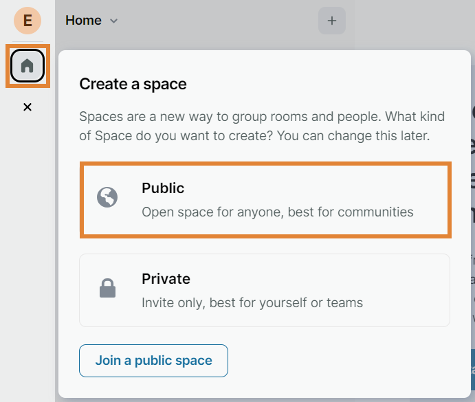 - Public space. Anyone will be able to find and join this space.