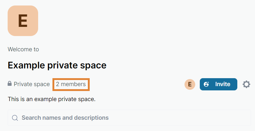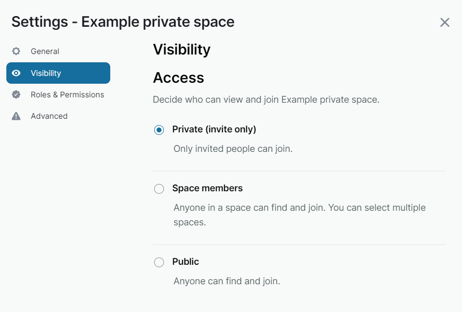 - Private space (invite only). Only people invited will be able to find and join this space.