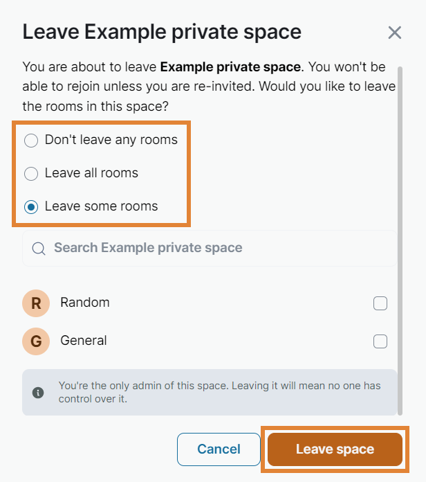 NOTE. You cannot rejoin a private space unless you are re-invited to it. If you are the only admin of a space, no one will have control over it once you leave.