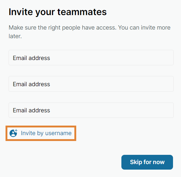 Enter the name, email address, or username of your teammate into the text field and select Invite. You can also share the space by selecting Share this space.If you don't want to invite your teammates yes, select Skip for now. You can invite them later.