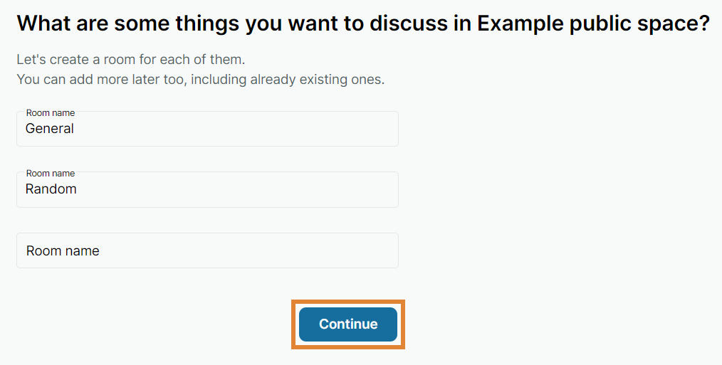 Create rooms for your public space. You can add more rooms later, including already existing ones. Finish by selecting Continue.