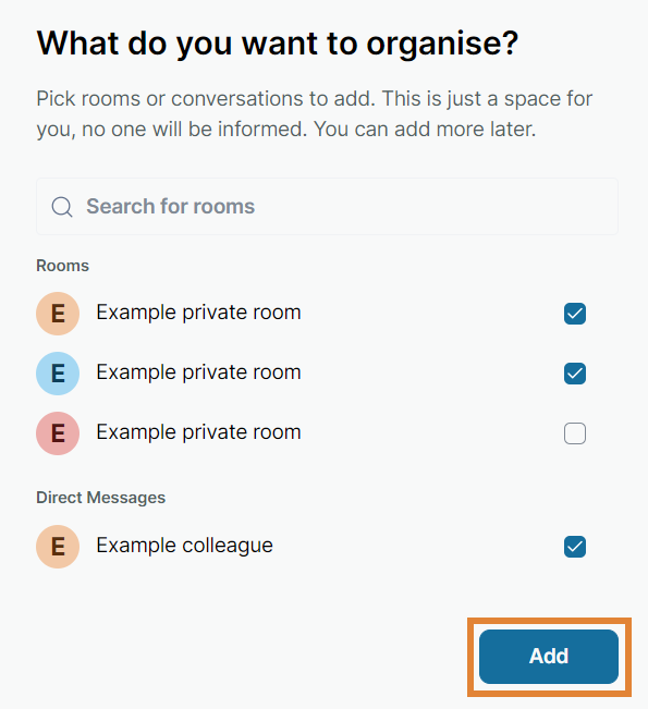 A. If you selected Just me, you can add rooms or conversations to your private space. Use the search bar to search for rooms or select them from the list below. Finish by selecting Add.